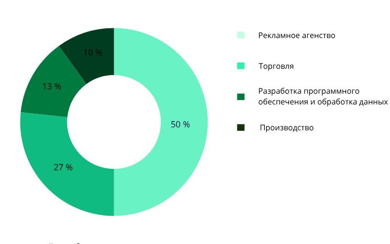 По направлению экономической деятельности, половина из тридцати крупнейших организаторов промоактивностей — это рекламные агентства. Их преобладание в Топ-30 обусловлено тем, что модель аутсорсинга широко распространена среди организаторов промоакций и конкурсов. Вторые по представленности в Топ-30 — торговые компании (8 из 30). Еще 4 компании относятся к направлению “Разработка программного обеспечения и обработка данных”. Вид экономической деятельности “Производство” представлен тремя компаниями.